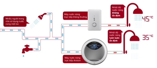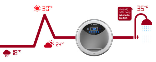 Với công nghệ ổn định nhiệt độc quyền từ Ariston, bất chấp nhiệt độ nước đầu vào bị ảnh hưởng bởi thời tiết và lưu lượng nước, nhiệt độ đầu ra vẫn luôn ổn định.