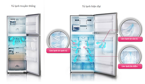 Tính năng làm lạnh đa chiều trong tủ lạnh LG giúp khí lạnh được lưu thông đều hơn tủ lạnh thông thường, những luồng khí lạnh phả ra không chỉ ở lưng tủ, mà cả thành tủ và thậm chí cửa tủ thông qua các ống gioăng kết nối, toàn bộ thực phẩm trong tủ nhận được lượng khi lạnh bằng nhau, giúp thực phẩm dù đặt ở góc tủ nào cũng được bảo quản tốt.